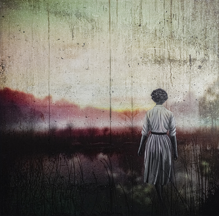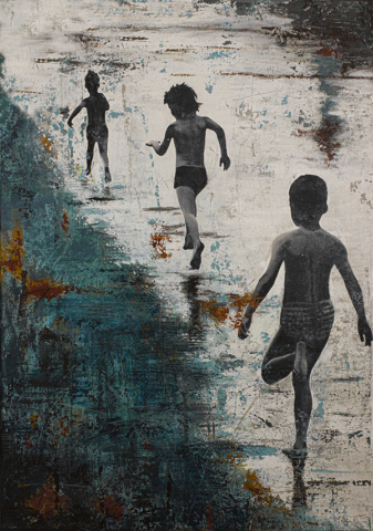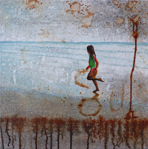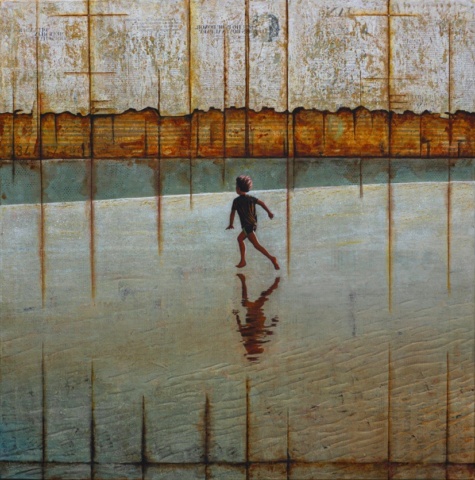 db Waterman is a Dutch contemporary artist known for her expressive mixed media paintings that combine figurative elements with abstract landscapes or urban textures. From her studio in Eindhoven, Waterman creates atmospheric landscapes in which solitary figures, often children, appear within layered surfaces of paint, collage and weathered materials.